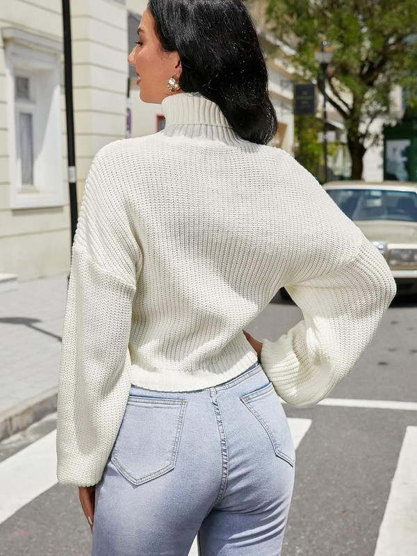 ZhiKnit Women's Cropped Turtleneck Sweater Lantern Sleeve Ribbed Knit Pullover Sweater Jumper